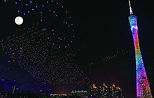 元宵節(jié)當晚9時,1000架億航GHOSTDRONE 2.0智能無人機在廣州海心沙廣場上長達290米、寬19米的“跑道”上整齊列陣。倒計時一聲令起,千架無人機自動有序地緩緩起飛騰空,恰似漫天飛舞的流星,照亮廣州夜空。